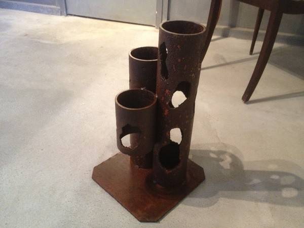 Philippe Nembi a crée ce porte parapluie en acier veilli rouille pouvant contenir 3 parapluies.