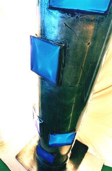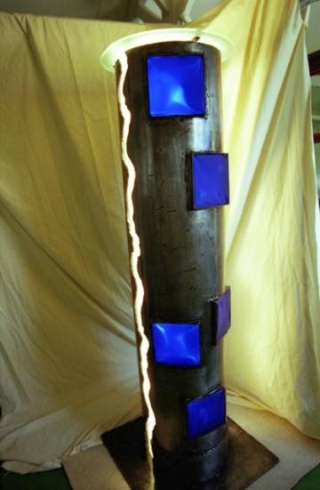 Sa composition est la suivante: tube en fer 14 pouces traité et verni, verre 8 mm dépoli, 5 verreries Perses de 200 bleu foncé, variateur Arnould 20282, 4 ampoules 100 W Halogène IDE E27/ES.