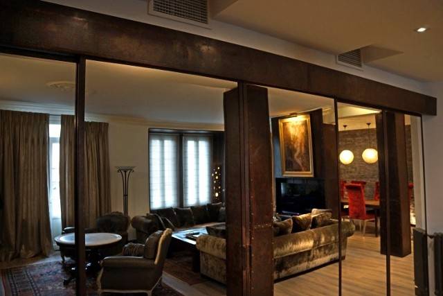 NAD a fabriqué et posé ce coulissant miroir en fer de 6 m de long et 2,5m de hauteur, composé de 5 panneaux, dont 2 ouvrants, sur rails suspendus.