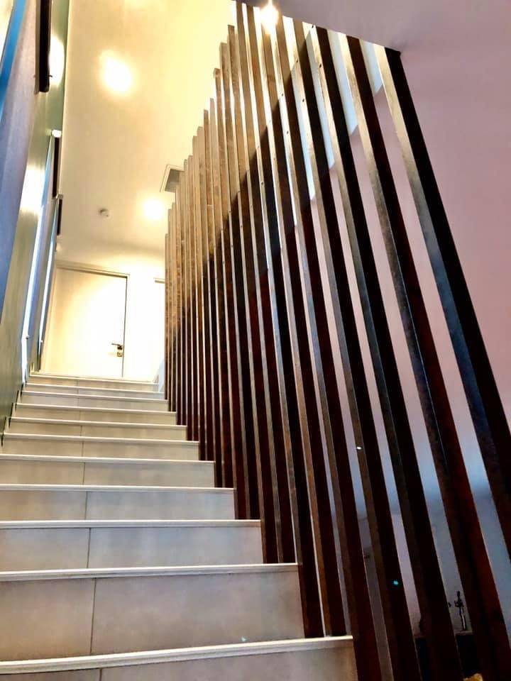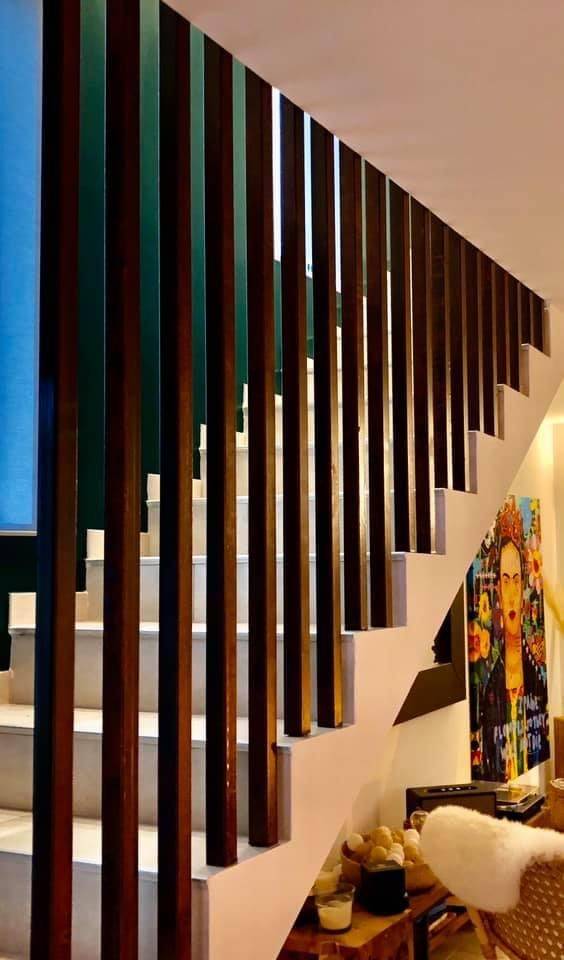 Ce garde corps pour escalier conçu par NAD est composé de tube en acier traité (rouille chocolat) de 40x40 fixés sur les marches de l'escalier et de face contre le plancher.