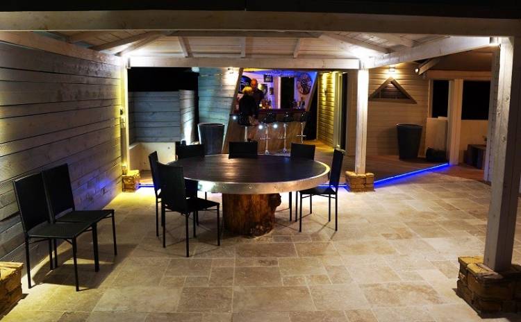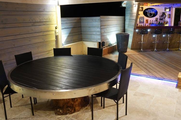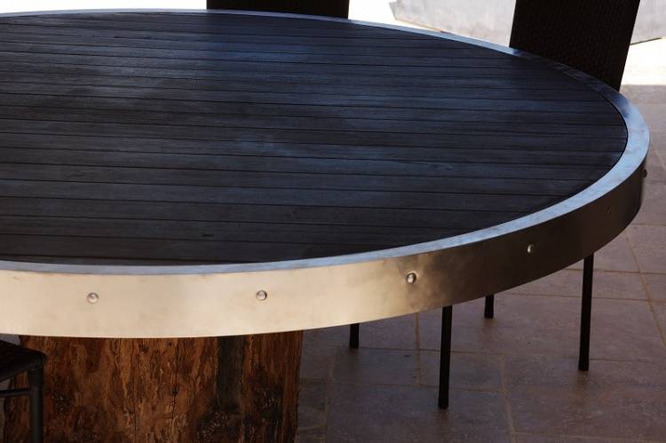 Philippe Nembi a fabriqué et posé cette table en bois, avec cerclage en inox, de 1890 de diamètre.